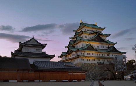 茶会終了後、人気のない内苑からの本丸御殿と天守閣を望む黄昏の空を背景にライトアップされた天守閣の上で金のシャチホコが輝いていました。